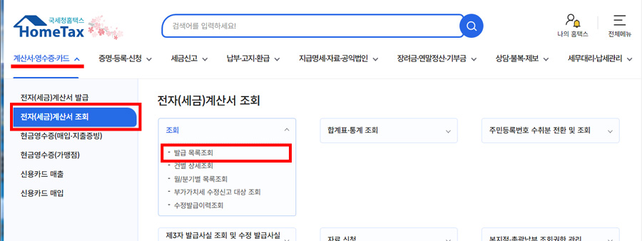 . °è»ê¼.¿µ¼öÁõ.Ä«µå -> ÀüÀÚ(¼¼±Ý)°è»ê¼ Á¶È¸ -> Á¶È¸ -> ¹ß±Þ ¸ñ·ÏÁ¶È¸